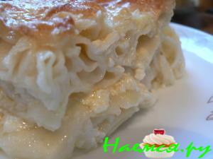 Дальше раскатываем тесто по величине формы и получившийся пласт опускаем в кипяток на 30 секунд, после чего вынимаем и кладем в форму, смазываем маслом.