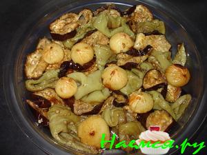Овощи порезать кружочками, сложить на противень посолить поперчить смазать оливковым маслом и запечь около 20 мин в духовке.