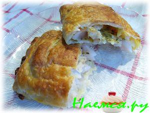 Разморозить тесто, развернуть и нарезать квадратиками примерно по 5 см.