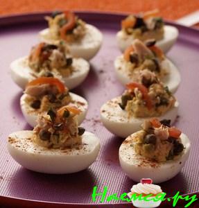 Половинки яиц начиняем полученной смесью и выкладываем на тарелку, предварительно украсив ее листьями салата.