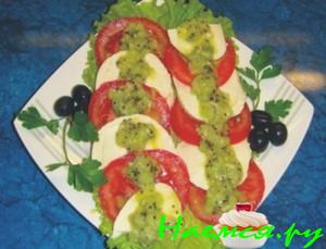 Порезать моцареллу кружочками 5 мм толщиной и разложить на блюде. В чашке смешать нарезанный чили с нарезанными оливками, цедрой лимона и раздавленным чесноком. Добавить соль, масло, петрушку и смешать вместе,чтобы сделать сумасшедшую гремолату. Налить ложкой гремолату в центр кружочков моцареллы.