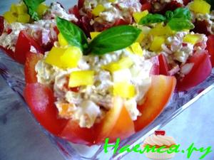 Укаждого помидора срезать верхнюю треть.Чайной ложкой вынуть мякоть и нарезать ее кубиками.