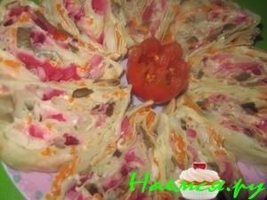 На колбасу положить следующий лист лаваша, смазать его тонким слоем кетчупа. Затем выложить морковь по-корейски.