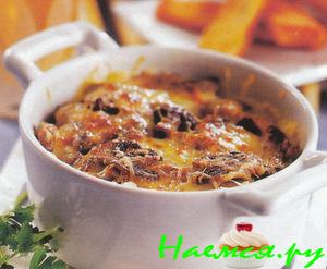 Грибы (любые) отварить, обжарить с луком на сливочном масле7-10 мин. , подсолить, поперчить . Разложить в кокотницы , залить сливками. Сверху посыпать тертым сыром. В духовку (лучше гриль) до румяной корочки.