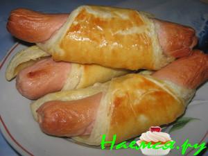 Смазав руки растительным маслом, скатываем шарики из дрожжевого теста (покупается в магазине). Из шариков вытягивается полоска и обматывается ею сосиска в натаральной оболочке, предварительно обмытая (можно очищенную). Выкладываются на противень и кладём в разогретую духовку 200-220 градусов на 13- 15 минут. Вынув, смазываем сливочным маслом или маргарином.