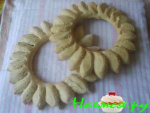 Выложить на тарелочку , сформировав лучики так называемого солнышка , а в серединку налить соус.
