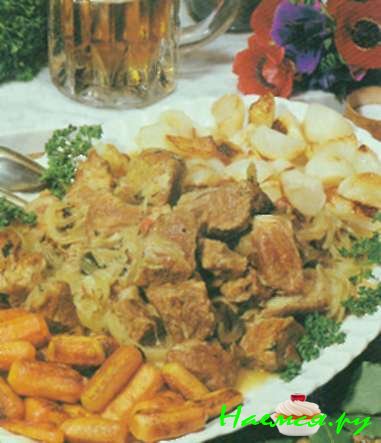 На шесть порций приобретите кусочек ветчины весом 1,5 кг с корочкой. Посыпьте мясо перцем и обжарьте на среднем огне на небольшом количестве растительного масла. Затем добавьте две крупно нарезанные головки репчатого лука и готовьте его с ветчиной еще 5 мин, время от времени помешивая.